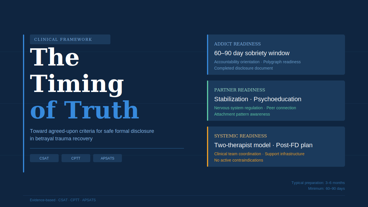 Formal Disclosure (FD) is widely recognized as a pivotal intervention in the treatment of sexual betrayal and addiction-related relational trauma. Yet despite its clinical centrality, the field lacks a shared, operationalized framework for determining when FD is safe, for whom, and under what relational conditions it should proceed. This article integrates perspectives from Certified Sex Addiction Therapists (CSATs), Certified Partner Trauma Therapists (CPTTs), and APSATS-credentialed clinicians to propose a multi-domain readiness framework — one that addresses not only the addict's sobriety and accountability, but also the partner's neurological, relational, and psychological capacity to receive disclosure in a way that serves genuine healing. Critically, this article argues that the partner's relational style and attachment patterns — including those that may mirror a critical or punitive parental figure — are endogenous clinical variables that must be assessed and addressed in pre-disclosure preparation, not exogenous factors to be overlooked. Agreed-upon criteria and rough timeframes are proposed, with the understanding that healing is non-linear and clinical judgment must always supersede rigid timelines.